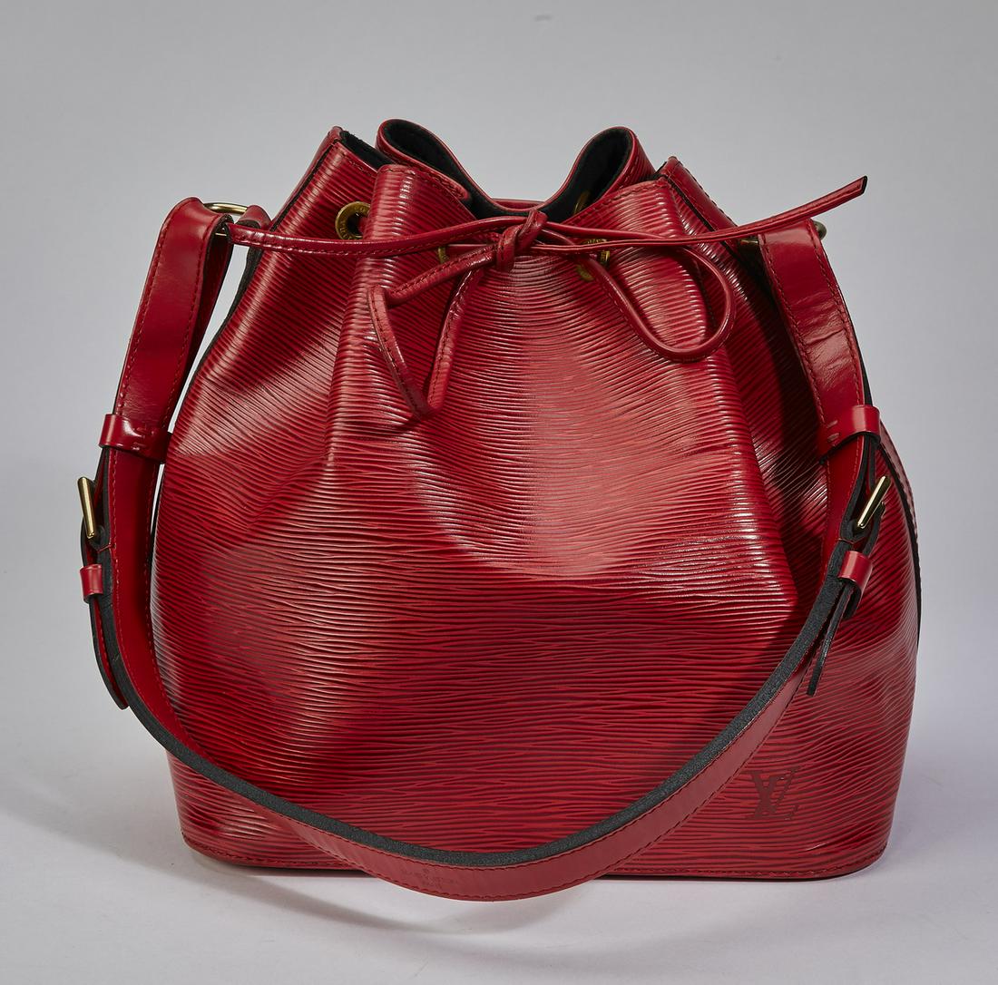 SoldLouis Vuitton Red Leather Epi Noe Shoulder BagLouis Vuitton Red Leather Epi Noe PM Shoulder Bag with Gold Tone Hardware. LV monogram lower right, logo on hardware, and cinch-cord closure. Appropriately labeled. Serial number AR0965. Measures 10-3See Sold Price