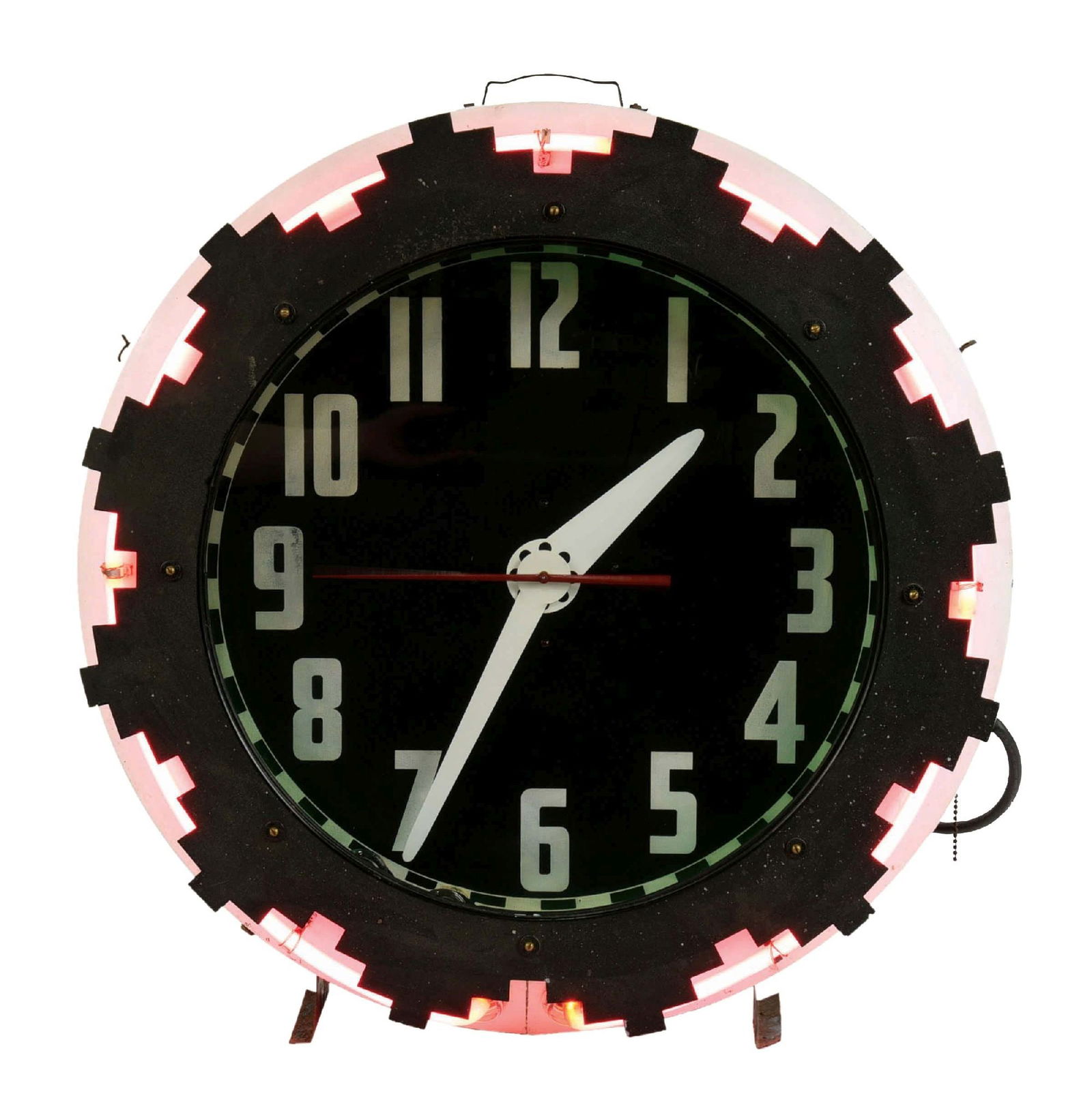 SoldCleveland Electric “Aztec” Neon Clock.Cleveland Electric “Aztec” Neon Clock. Cleveland, OH, ca. 1930s. Electric clock. Working red and green neon; clock runs. 26” diam. 7” width. Very good.See Sold Price