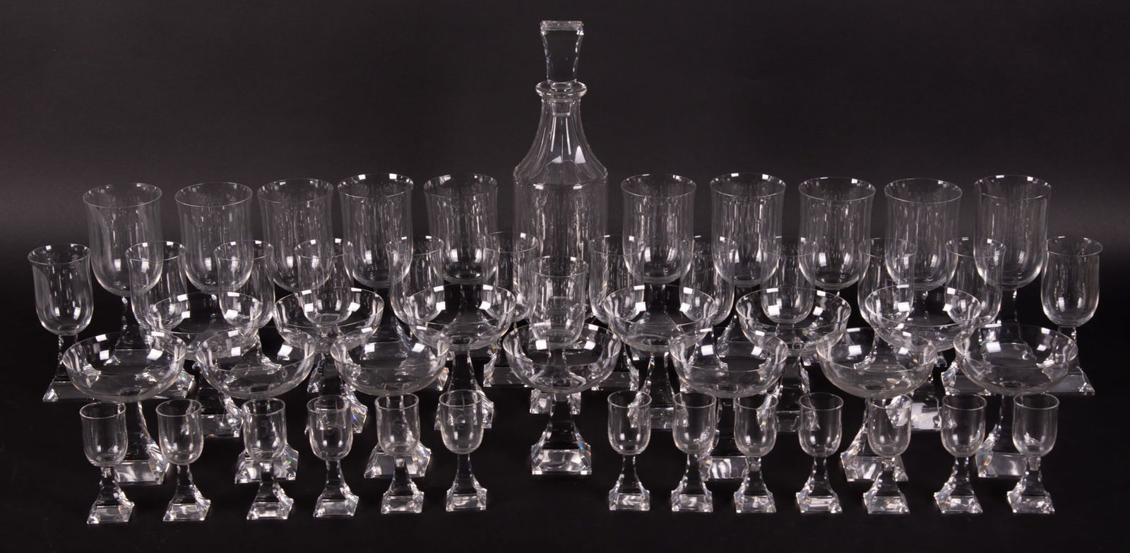 SoldBACCARAT CRYSTAL STEMWARE & DECANTERS, 60 PCS.BACCARAT, CRYSTAL STEMWARE & DECANTERS, 60 PCS.:Sixty piece set with two decanters, including: 6 champagnes (H 4 1/2", Dia 3 3/4"); 6 glasses (H 7 1/2", Dia 3"); 4 glasses (H 8 1/4", Dia 3 1/4"); 6 snSee Sold Price
