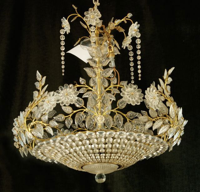 SoldPair of Bagues Style Crystal Ball ChandeliersManner of Maison Baques (French, founded 1840), second half 20th century. A matched pair of gilt metal and iron Baques style crystal ball form flower chandeliers, both with crystal canopy issuing flowSee Sold Price