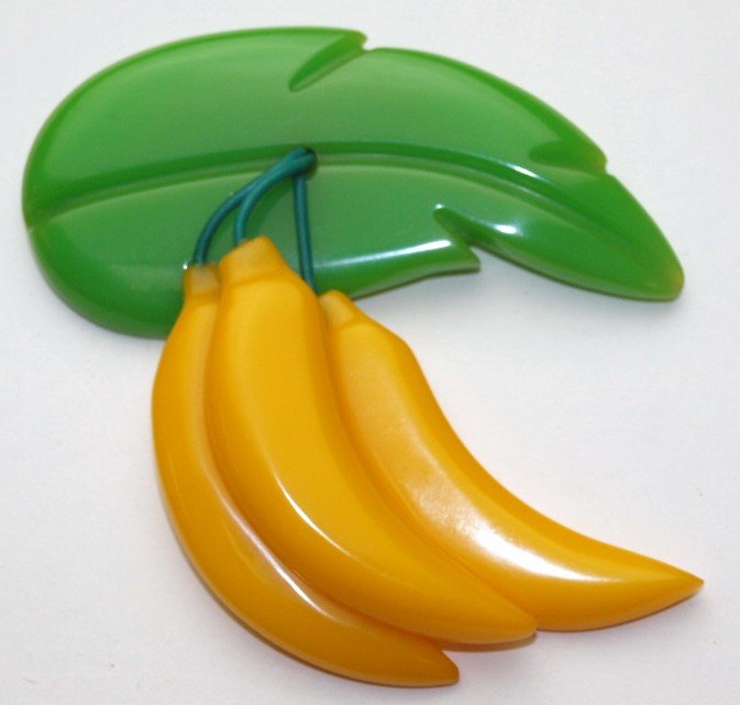 SoldBAKELITE BANANA BROOCH1940'S BAKELITE CARVED BANANAS DANGLING FROM GREEN LEAF BROOCH-6 BANANAS-FRONDS WORNSee Sold Price
