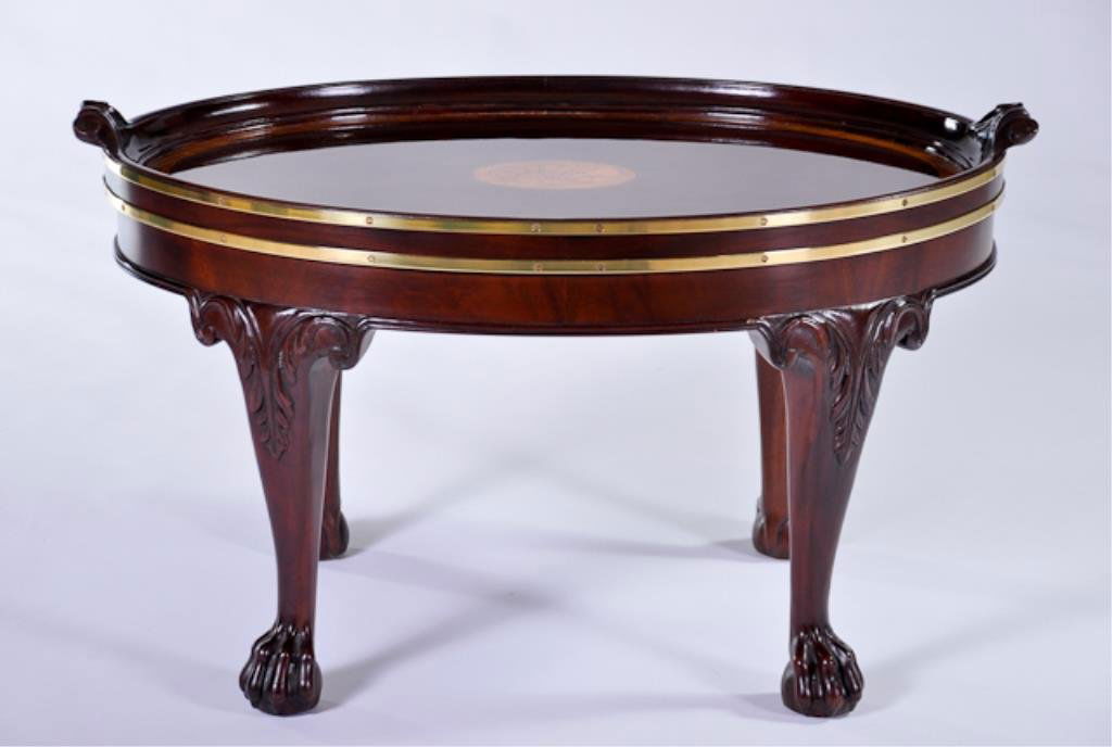 SoldVintage Baker Mahogany Campaign Style Oval Coffee TableVintage Baker Mahogany Campaign Style Oval Coffee Table, with Gallery Top,Carved Handles, Satinwood Shell Inlay in the Center, Double Brass Band Around the Apron and Resting on Cabriole Legs with AcanSee Sold Price