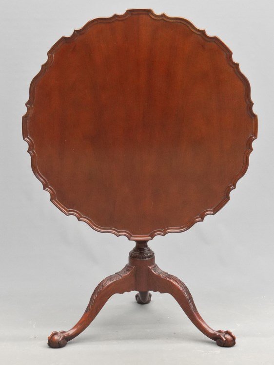 SoldA Chippendale Style Carved Mahogany Pie-Crust Tilt-TopA Chippendale Style Carved Mahogany Pie-Crust Tilt-Top Tea Table Baker, Historic Charleston Reproductions, 20th Century Height 30 1/4 x width 33 x depth 33 inches. Property from a Prominent Midwest EsSee Sold Price