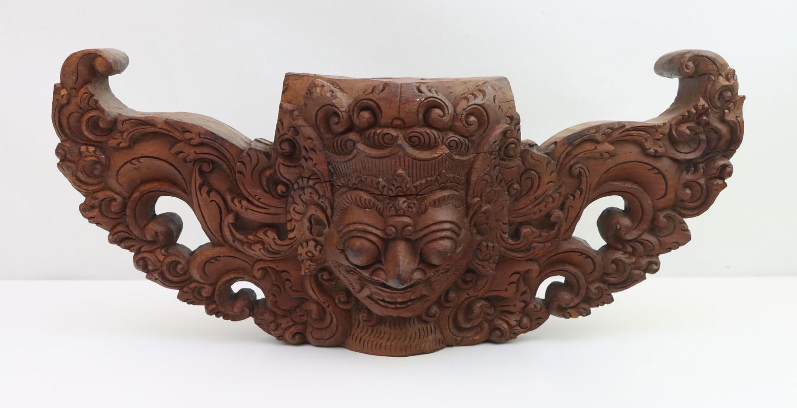 SoldDemon Architectural Element from a Balinese TempleOrnate carved wooden architectural element featuring a winged demon with fangs and elaborate accents. The carved wooden section is a central part of the temple, mounted on the central beam and known aSee Sold Price