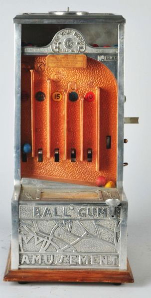 SoldBall Gum Hold and Draw Trade StimulatorExcellent Art Deco Vintage Ball Gum 1 cent or penny Slot Machine. Working condition, with restored paint and chrome plating. Key present. 13" x 13" x 10" Keywords: Las Vegas, Bar, Man Cave, MechanicalSee Sold Price