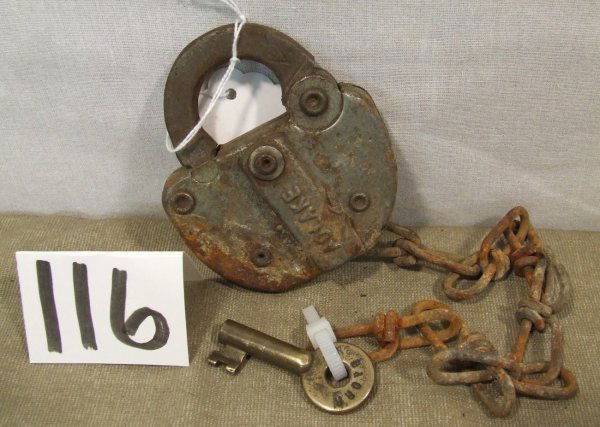 US EAGLE LOCK CO. TERRYVILLE CONN ALL BRASS LOCK, (NO KEY)CHICAGO BURLINGTON & PACIFIC RAILROAD 327 ALL STEEL LOCK (WITH KEY) PAT. MAR 29, 1920THE BALTIMORE AND OHIO RAILROAD (B & O RR) RARE ALL BRASS PADLOCK (NO KEY)CLEVELAND PUGET SOUND NAVIGATION 4-WAY BRASS PADLOCK STEEL SHACKLE (WITH KEY)UNION PACIFIC RAILROAD (UPRR), AMERICAN LOCK CO. U.S.A. HARDENED PGL SERIES 700 ALL STEEL LOCK (N...D.R.G.M., Lahure, English, & Unmarked Padlocks w/ KeysMar 01, 2026UNION STOCKYARDS OF OMAHA ADLAKE SWITCH ALL BRASS LOCK WITH DUST COVER, (NO KEY)RICHARDS & CONOVER HARDWARE CO. RAILROAD GRADE BOHANNAN BRASS PADLOCK WITH DUST COVER PAT. JUNE 2...(2) Adlake and (1) CNR PadlocksMar 01, 2026ATCHISON, TOPEKA AND SANTA FE RAILWAY (AT&SF) W. BOHANNAN 115 - STOCKYARDS ALL BRASS LOCK WITH D...UNION STOCKYARDS OF OMAHA ADLAKE ALL BRASS LOCK WITH DUST COVER (NO KEY) PAT# 2040482FRAIM RAILROAD LOCK W/ CHAIN & NY&LB KEYFeb 21, 2026EAGLE ALL BRASS LOCK, (NO KEY)ATCHISON, TOPEKA AND SANTA FE RAILWAY (AT&SF) ADLAKE ALL STEEL LOCK WITH DUST COVER, (NO KEY) PAT...UNION PACIFIC RAILROAD CS-1 ADLAKE A&W BRASS SWITCH LOCK (WITH KEY) AND DUST COVEREarly Ball and Chain With PadlocksMar 01, 2026