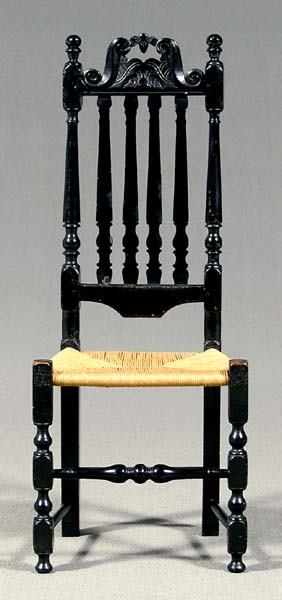 SoldWm. & Mary Banister Back Arm Chair in Black PaintWilliam and Mary banister back armchair in old black paint with a nicely detailed carved crest and finials. Nice turnings and button feet. Seat height 17 1/4"See Sold Price