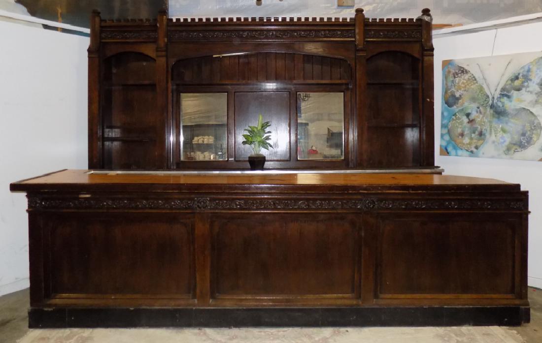 SoldGothic style mahogany front & back barGothic style mahogany front & back bar. Back bar 92"h x 84.5"l 14"d Front bar 39.5"h x 84.5"l x 23.5"dSee Sold Price