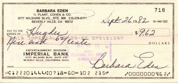Barbara Eden Signed Check UACC PADA
