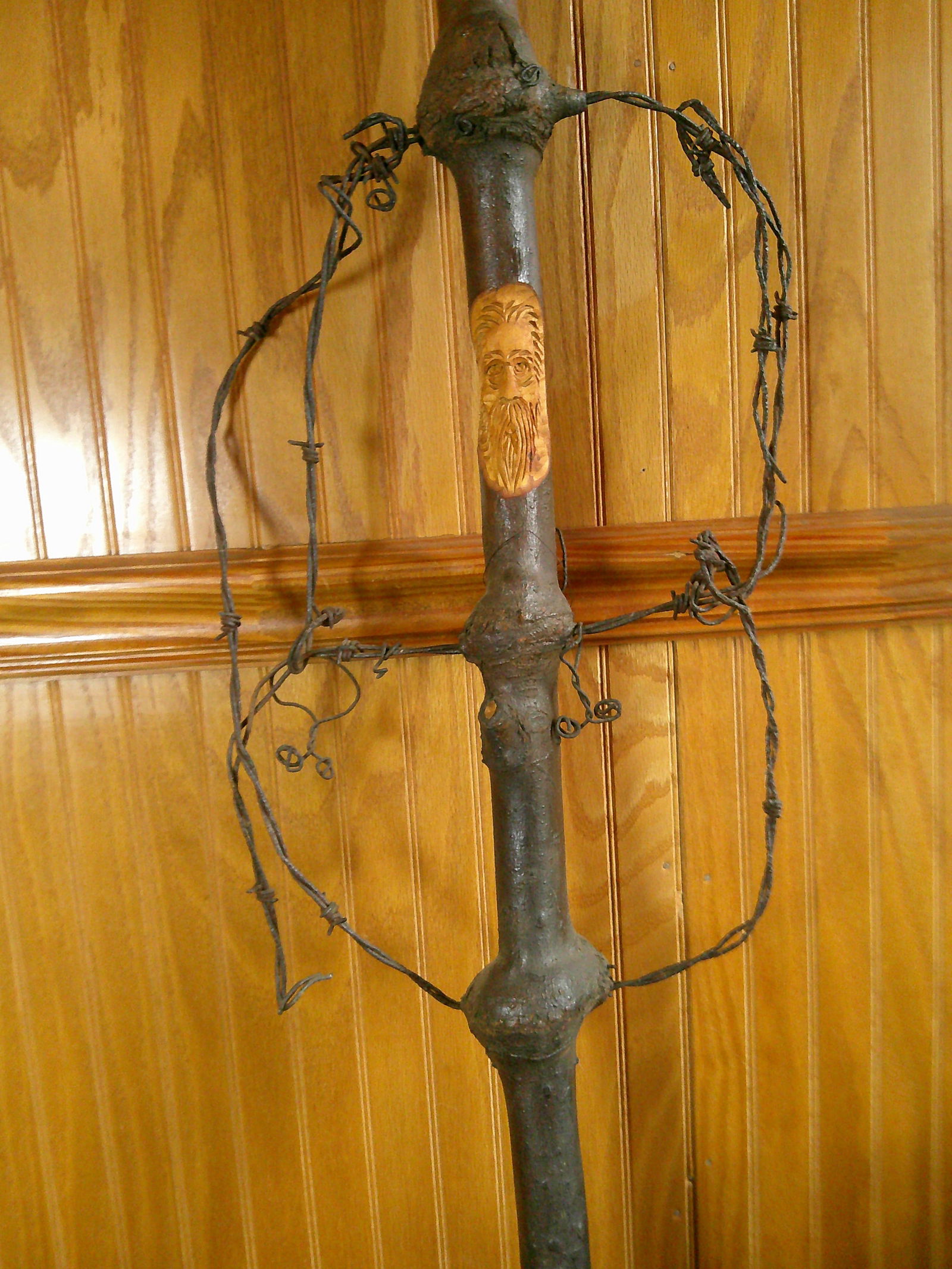 Barbed wire woven through carved stick