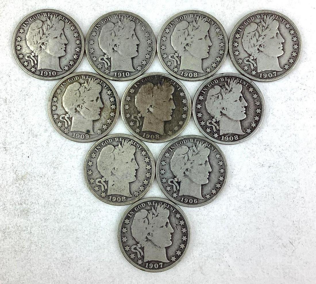 SoldLot of 9 Silver Barber Half Dollars and 6 Barber QuartersNice lot of Barber halves (9) and quarters (6).See Sold Price