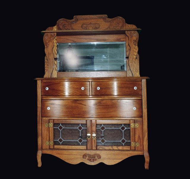 SoldTiger Oak Antique bar Buffet with MirrorTiger Oak/Oak Antique Bar Buffet with Mirrored top framed by an ornate column and a shelf in either side. The serpentine workspace measures 48" x 22 1/2" and has two drawers. The drawers are serpentinSee Sold Price