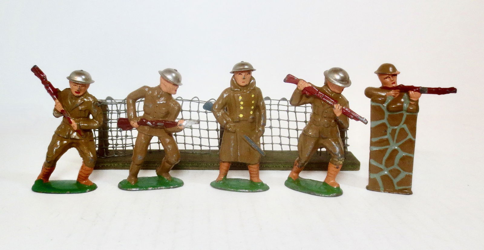 SoldBarclay Dimestore SoldiersWith Wire Fence. 6 pieces. Excellent to very good condition (4 replacement helmets). No boxes.See Sold Price