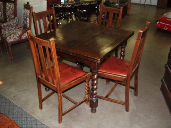 Sold1930s Oak Draw Leaf Table & 4 Chairs.1930s Oak draw leaf table with 4 Oak chairs. Barley twist legs. Table: 36" W, 36" D, 29.5" H (leaves in), Chairs: 18.5" W, 17" D, 36" H.See Sold Price