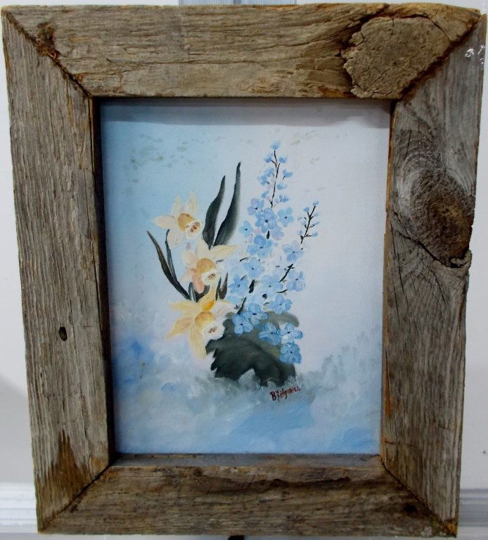 SoldAline Peters, American/Texas, 20thC.,oil on canvasAline Peters, American/Texas, 20th C., oil on canvas, “Bluebonnets and Cactus”,Signed 1969, in a rustic barn wood frame; framed size 21” x 25-1/2”See Sold Price