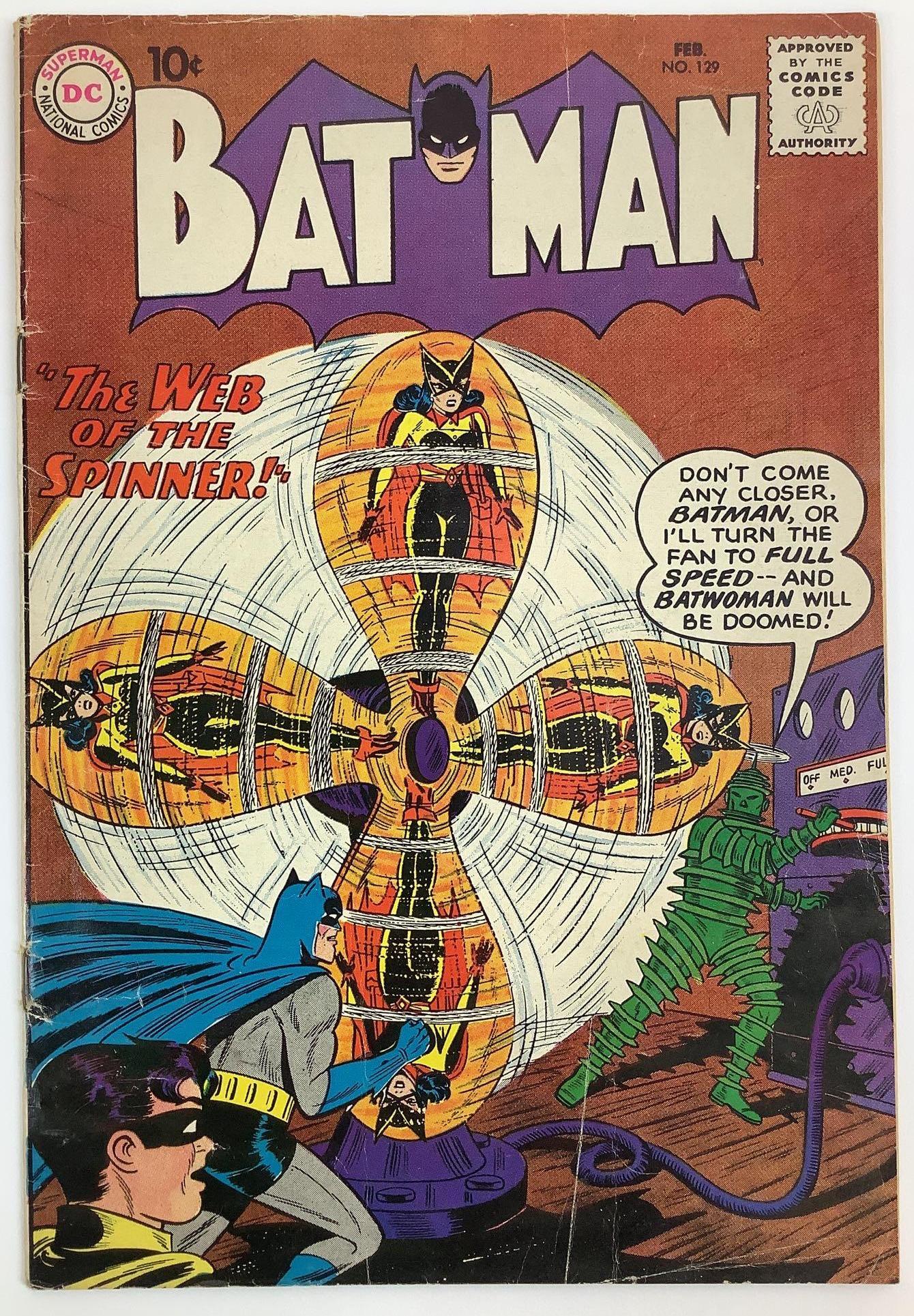 Two Batman 10 cent comics 129 and 146Two Batman 10 cent comics 129 and 146, books are .5 to 1.0 range, 129 cover has torn through staples but is still attached, splits and wear along the spine, brittle with chipping as seen, 146 has compSee Sold Price