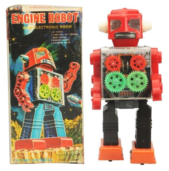 SoldJAPAN Battery Op ENGINE ROBOT w/ BOXNice looking Robot made by SH Japan with the original box. The toy has light wear and a a stable crack in the chest plate. Worked when tested. Includes graphic original box. 9", Very Good-ExcellentSee Sold Price