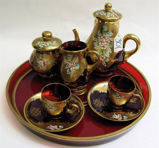 BAVARIAN RUBY RED TEA SET WITH TRAY: ornate gold a