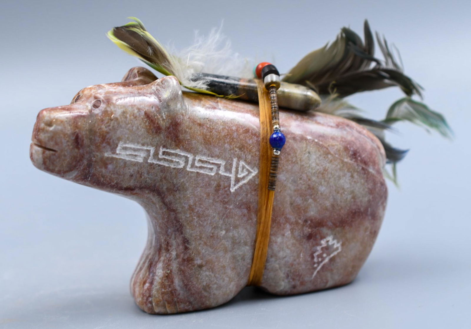 Bear Fetish with beadwork, feathers, engraving