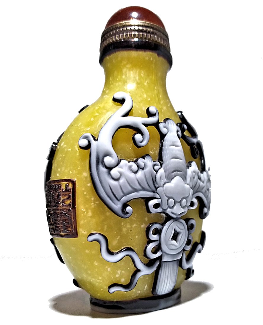 SoldCHINESE PEKING GLASS SNUFF BOTTLE YELLOW BATS COINS QIANLONG SEALTHE BEAUTIFUL CHINESE CARVED SNUFF BOTTLE IS SO FINELY CARVED WITH MUCH DETAIL IN GREEN OVER YELLOW GLASS. IT DEPICTS BATS, COINS AND RIBBONS. IT BEARS QIANLONG SEALS ON ITS SHOULDERS. THE BOTTLE IS 3See Sold Price