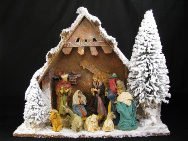 BEAUTIFUL NATIVITY SET MANGER SNOW TREES