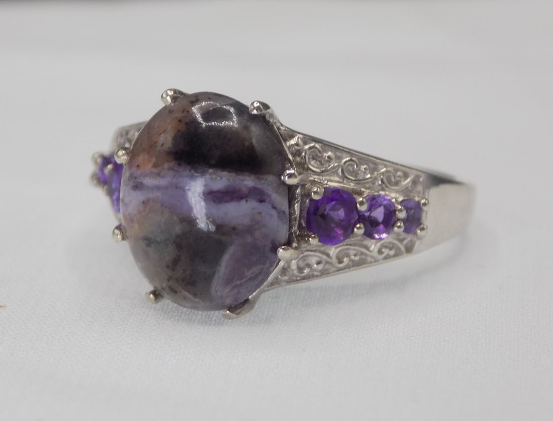 SoldBeautiful moonstone and amethyst sterling silver ringBeautiful moonstone and amethyst sterling silver ring. Marked as shown in photos. Great quality and detail. Please see photos. Size 9See Sold Price