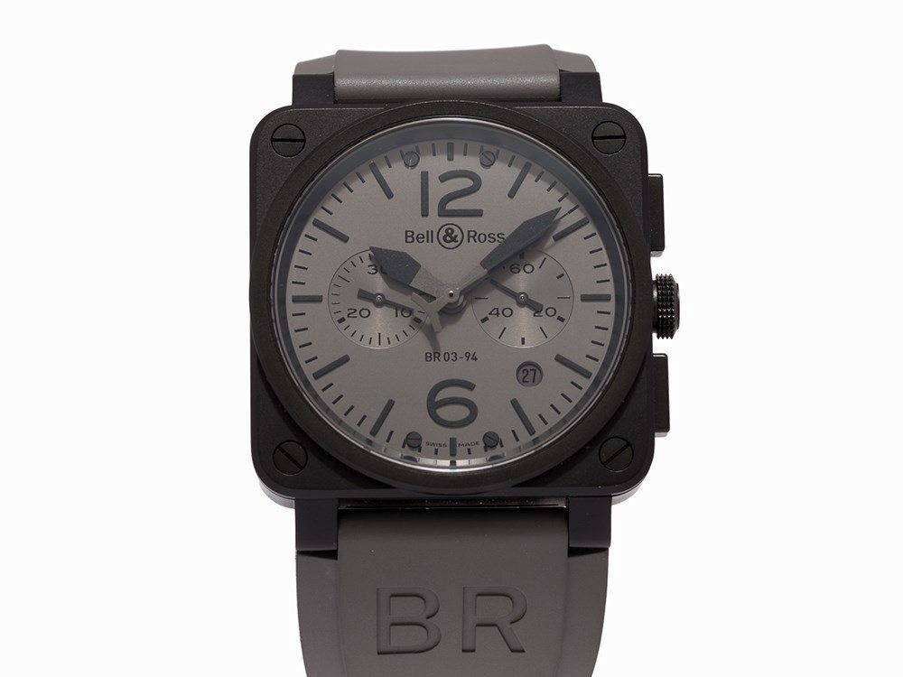 SoldBELL & ROSS, CERAMIC 'BR03-94 HERITAGE' CHRONOGRAPH WATCHBELL & ROSS, CERAMIC 'BR03-94 HERITAGE' CHRONOGRAPH WATCH Maker: Bell & Ross Model: BR 03-94 Heritage Reference number: BR 03-94 Case size: Approx. 42 mm Case material: Matte black ceramic Dial: MatteSee Sold Price