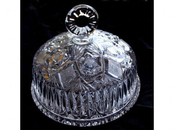 SoldLarge Vintage American Brilliant Cut Crystal Cake StandImpressive, very detailed footed cake stand with a dome cover. Measures 15"H including cover, 12.5"dia. This lot has no reserve.See Sold Price