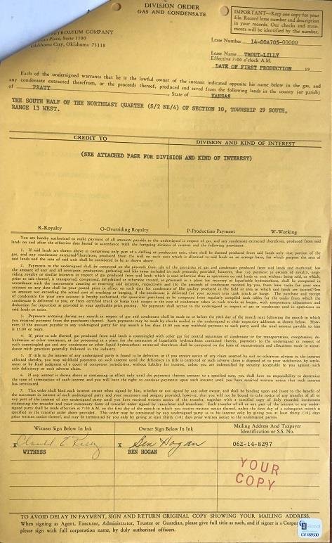 Ben Hogan- Signed Gas Contract from 1982