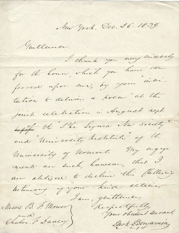 BENJAMIN, PARK - poet. ALS, 1839