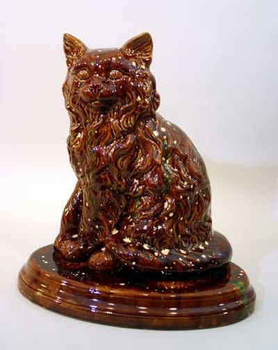 SoldBENNINGTON TYPE CAT BANKBENNINGTON TYPE CAT BANKRockingham glaze, likely American, 19th century. Pottery bank with mottled black and brown glazes in the form of a cat's head. 4" height, 3.25" diameterSee Sold Price