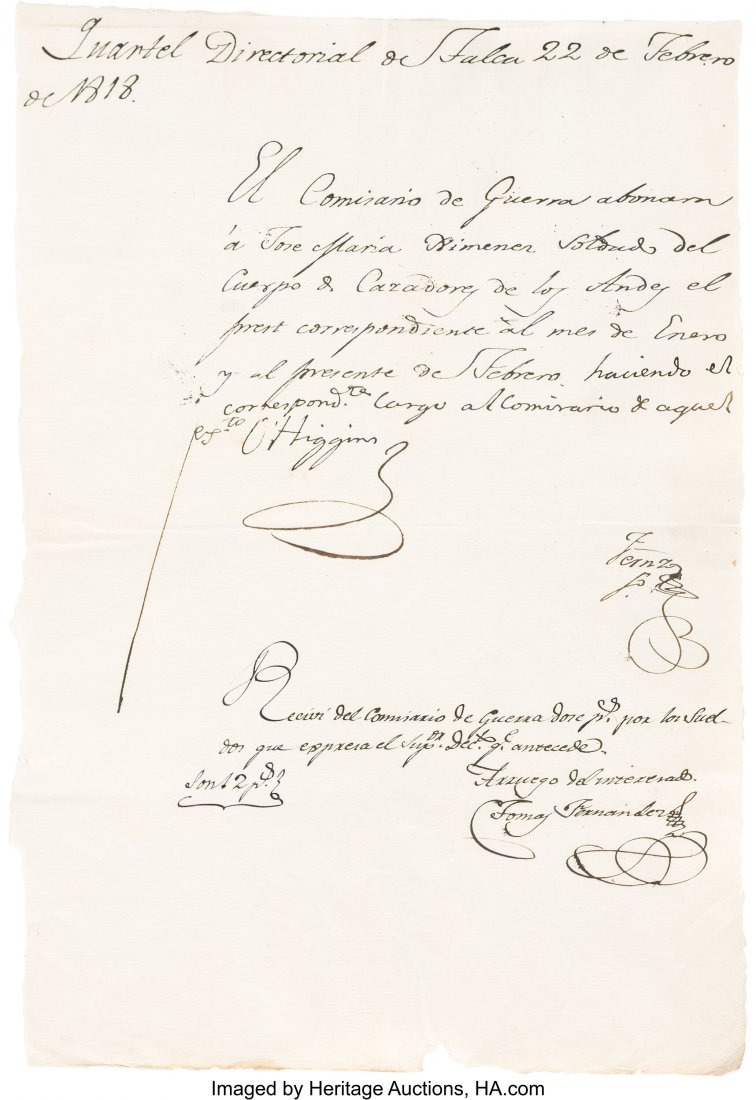 Bernardo O'Higgins Document Signed. One page, 8"