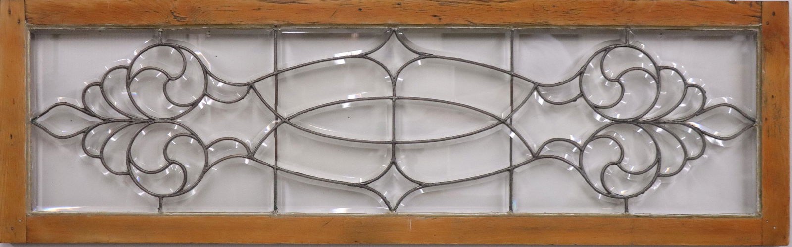 SoldBeveled Glass Transom WindowA turn of the century Beveled Glass transom window. Scrolled foliate leaded design with beveled glass panels in a wooden frame. Some wear, one cracked panel. 58 x 18 1/4" high overall. ESTIMATE $200-3See Sold Price