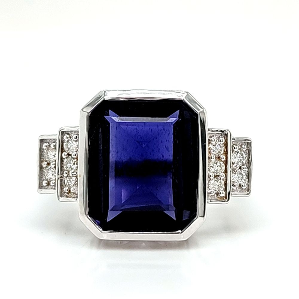 Bezel-Set Iolite Ring w/ Stepped Diamond Shoulders