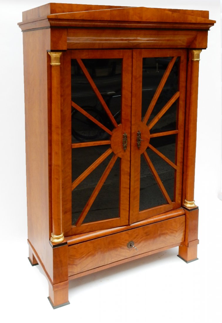 SoldBiedermeier Two-Door VitrineAntique vitrine with sunburst mullion glass panels. One lower drawer. [42 1/2" L x 21" D x 71 1/2" H]. Splits in veneer. Minor splits in wood.See Sold Price