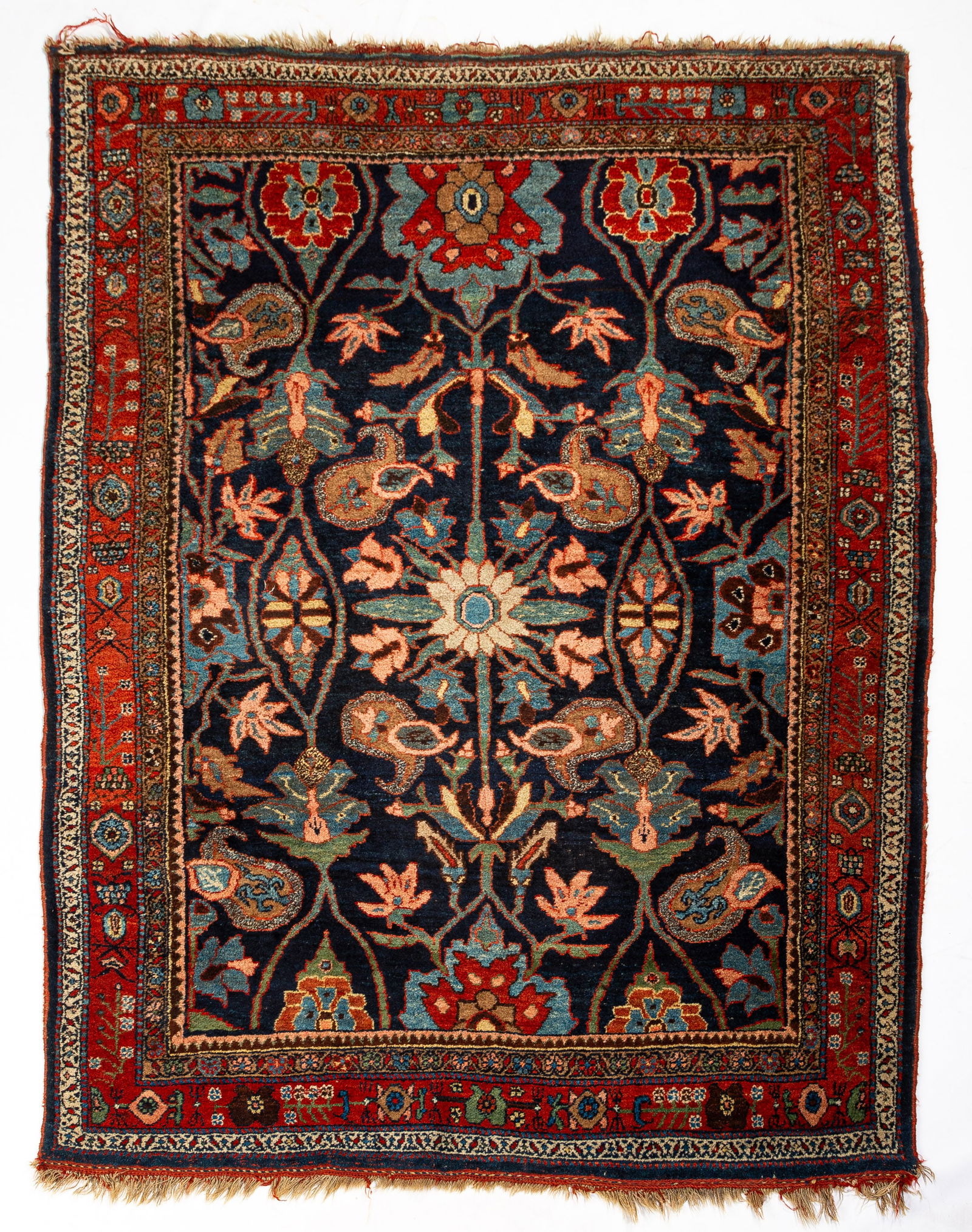 SoldSEMI-ANTIQUE PERSIAN BIJAR RUGC. 1920, possibly earlier. Differing dye lots in the blues. Dimensions: L 104.5" x W 65" Condition: Colors generally very fresh. Slight discoloration in the whites at one end. Few spots of wear. A fewSee Sold Price