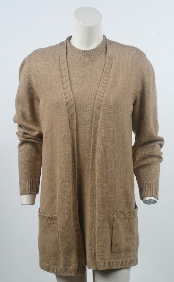 SoldBill Blass herringbone plaid wool sweater ensembleBill Blass herringbone plaid wool sweater ensemble, c. 1980's, for Saks fifth Avenue, (2) piece set with crew style sweater with banded bottom and cuff, v-neck cardigan with (2) front pockets, size S,See Sold Price