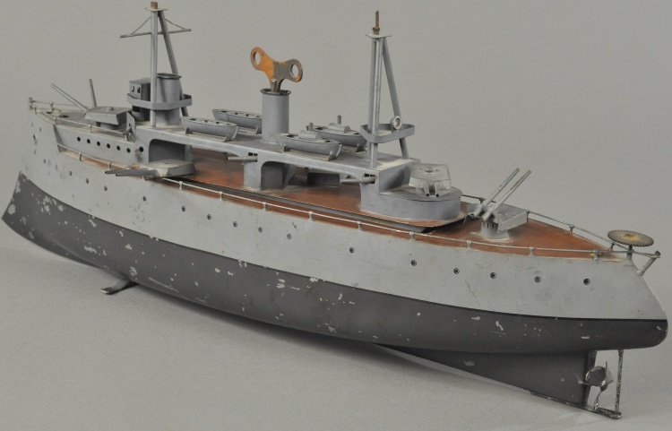 SoldTwo-Tone Gray Battleship - Bing Tin ToyMade by Gebruder Bing Company. Nuremberg, Germany - Ca. 1920. Gebruder Bing returned to the toy-making business shorty after the end of WWI. They redesigned their toy boat line to reflect the many draSee Sold Price