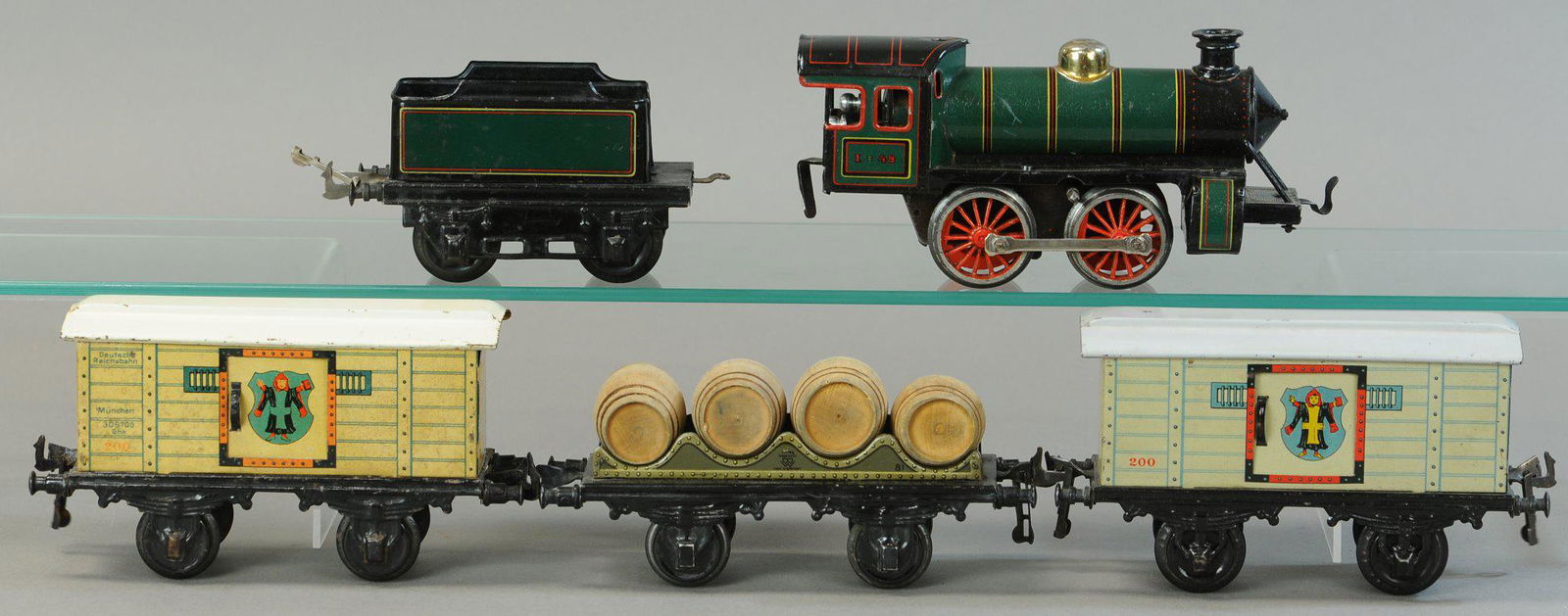 SoldBING gauge 1, 2-axled bulk goods car, 2-axled freight waggon with 4 wooden barrels, 2x 3-axledBING gauge 1, 2-axled bulk goods car, 2-axled freight waggon with 4 wooden barrels, 2x 3-axled passenger coaches, 1 2-axled baggage coach, slightly used, good condition German Description BING Spur 1,See Sold Price