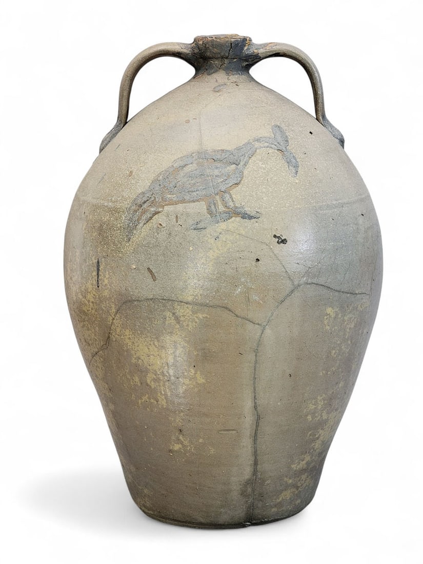 SoldOutstanding Bird Decorated Stoneware JarEarly 19th century, salt glaze with Albany glaze interior, very ovoid form with wide flared lip, two semi lunate handles, stamped 4 on shoulder over sgraffito and cobalt brushed tulip flower flanked bSee Sold Price