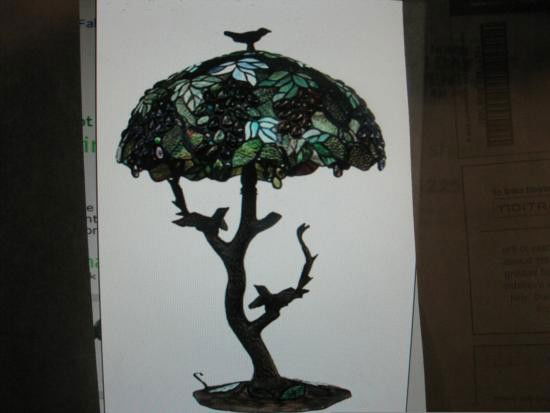 SoldStain Glass tiffany style Lamp Gorgeous!Tiffany Style Stain glass Grape Blossom Lamp 23" tall to top of finial 16" wide Shade no damage beautiful See picsSee Sold Price