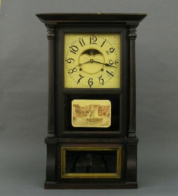 SoldBirge, Mallory & Co. Triple-Decker Shelf Clock.Birge, Mallory and Company Mahogany Triple-Decker Shelf Clock. Weight driven, 8-day movement. With building and pond reverse paint-decorated tablets. 38-1/2"h. x 18"w. x 5-1/2"d. Condition: Good withSee Sold Price