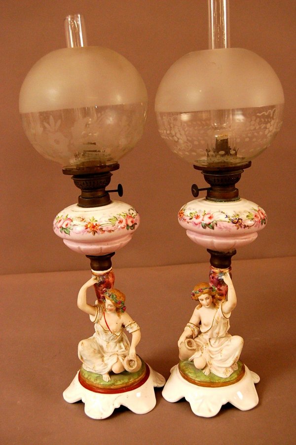 SoldPair Victorian Bisque Figural LampsPair of Victorian Lamps male and female figures in hand painted Bisque Porcelain white and gold bases, ht of Figures app 25 inches ht to finials app 42 inches. Both come with Victorian Lace silk and tSee Sold Price