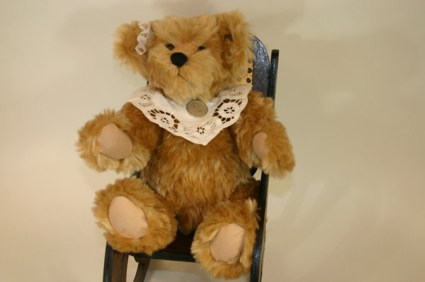 Steiff Teddy Baby Blue. 20" mohair bear with applied ears, glass eyes, stitched nose and mouth, diskSteiff Teddy Baby Blue. 20" mohair bear with applied ears, glass eyes, stitched nose and mouth, disk jointed head, arms and legs, flat blue soles to accommodate standing, working growler. Teddy Baby B