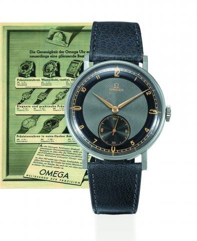 SoldA RARE VINTAGE OMEGA BLACK DIAL MILITARY WATCH. 3.5 cmA RARE VINTAGE OMEGA BLACK DIAL MILITARY WATCH. 3.5 cm diameter.See Sold Price