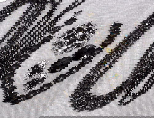 BLACK JET, BAKELITE NECKLACES, PIN, EARRINGS