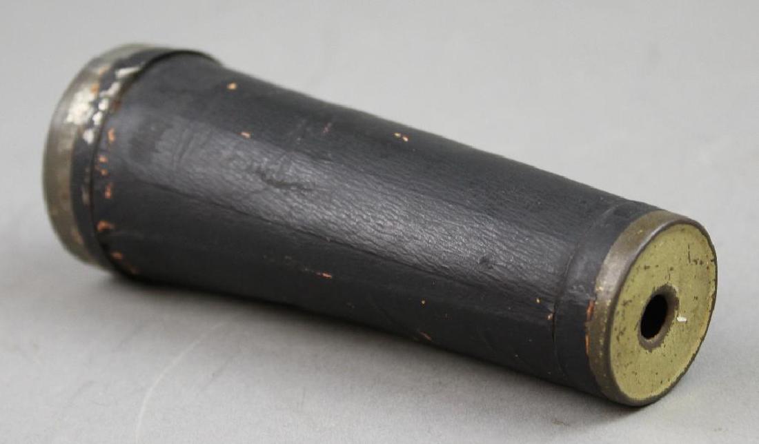 SoldCarved Bamboo KaleidoscopeCarved Bamboo Kaleidoscope, black finish with two fluid and sequin filled lucite rods, stained paper ends, length 11 3/4".[8] CONDITION: Paint wear, expansion splits on bamboo paper viewing end raisedSee Sold Price