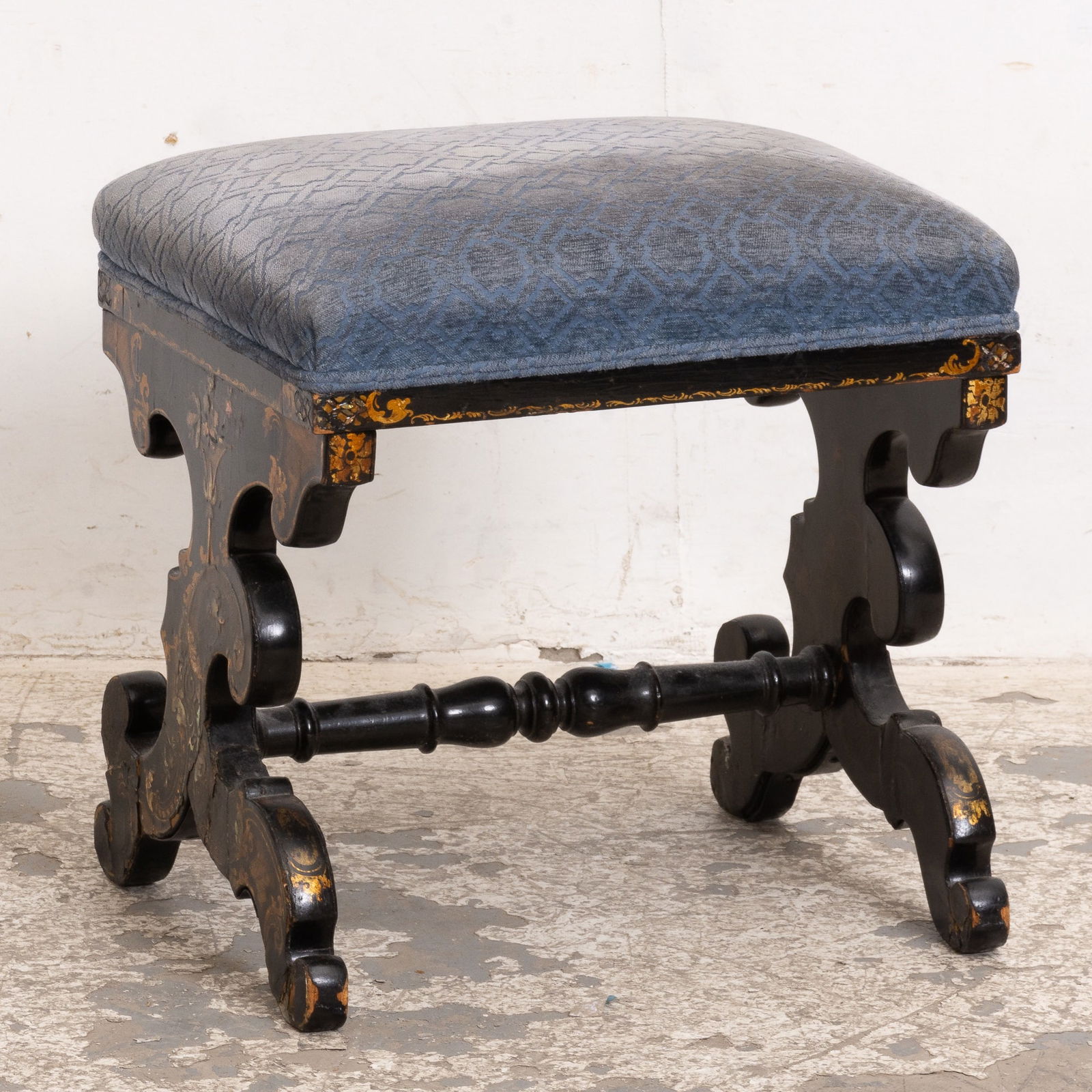 Black Painted Gilt Decorated Upholstered Stool