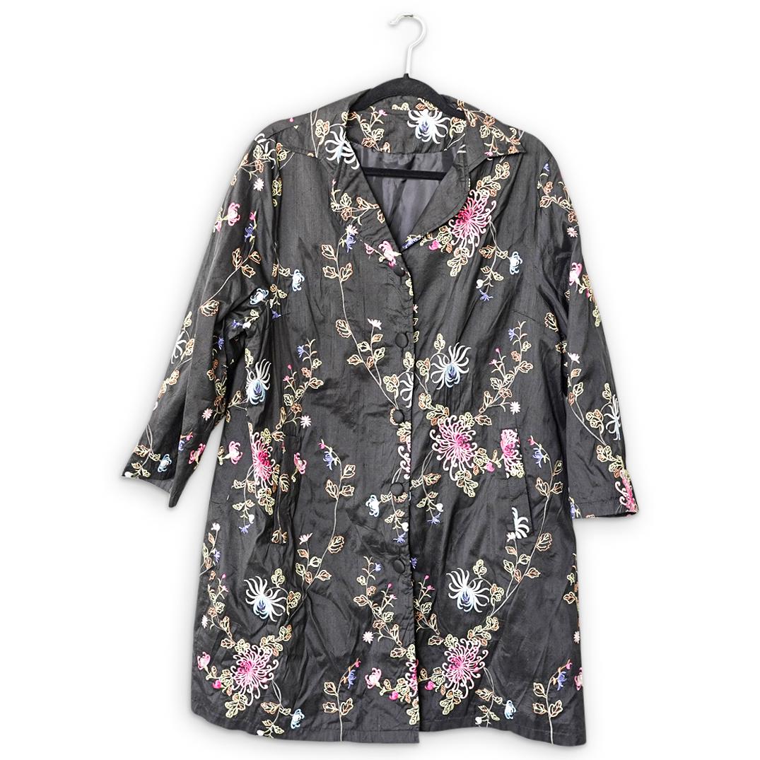 SoldJapanese Silk Embroidered Long JacketJapanese silk over jacket or robe. All embroidered with floral motifs and in good condition. C.a. 1950/50's. Made for a small woman. Has raised buttons and loops.See Sold Price