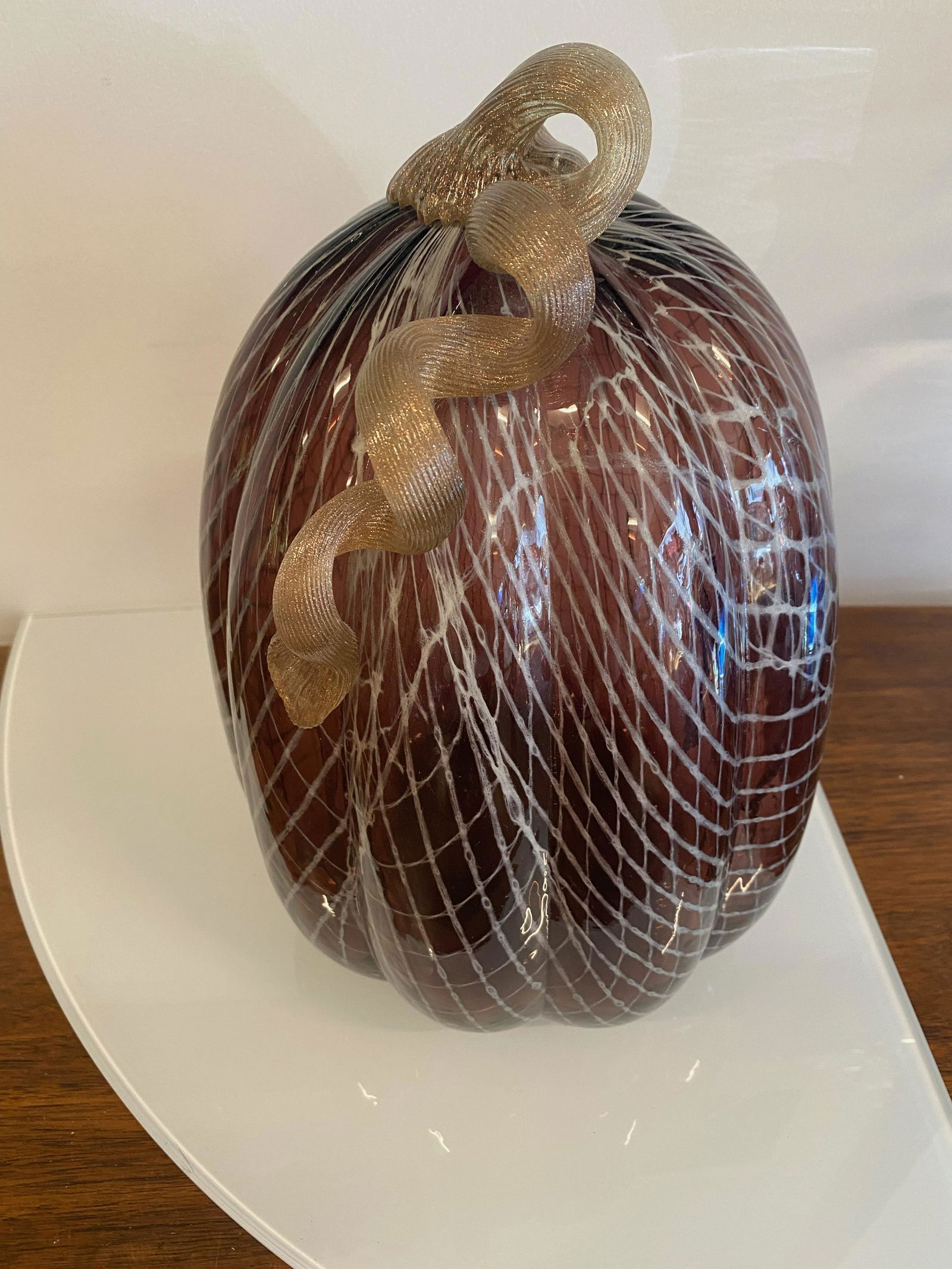 SoldVENETIAN MURANO ITALY ART GLASS FIGURAL PUMPKINA Murano Italian hand blown art glass figural pumpkin gourd fruit sculpture having a milk glass body with clear and completed with a twisted amber glass stem. Measures approx. 7 1/2" height x 9" diameSee Sold Price